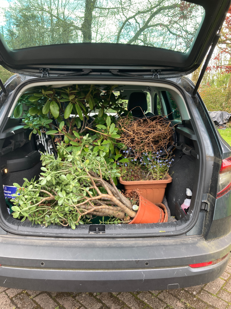 June got a call from her brother Peter saying that he and his wife Marielle had decided to emigrate to Thailand before the end of May. It’s been a plan of theirs for many years and they bit the bullet during their recent holiday out there. We struggled downsizing before we moved from Worton, but having to put all your possessions into 6 suitcases is something I would never want to contemplate – the stuff of nightmares! The upside however is that they can’t take their plants with them. The back of our car was chocka with strawberry planters, rhododendron, lilies, hosta’s, two money trees and a hydrangea. The family bible and a pile of old family photos completed the visit as again, space is of a premium on the flight and certain family possessions can’t be just dumped. The plants have started to be redeployed in their new homes and should give some spectacular statement pieces, due to their size and be a reminder of a branch of the family.