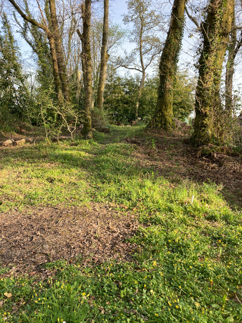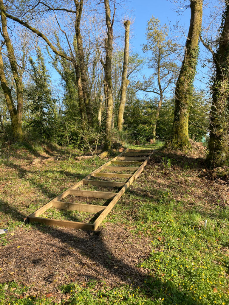 I made the decision to put some steps down into the woods as the bank is a bit steep and dangerous for non mountain goat footed individuals. This has been spurred on by my side project of reclaiming the woods from brambles and other rubbish, especially after seeing an old photo on the web of a sunny green glade from a sales brochure from about 10 yrs ago. I got plenty of advice from our friend Dave and used the wood I’d purchased for the proposed decking last year. I stood, looked, measured, calculated and drew up a couple of options, then did it all again until it looked right. Then I put down a 7.2m side rail, measured and marked for the 8 steps, then realised I had one remaining. Divide by 9 not 8, and then all 8 steps are used – durr! Due to other events, I will have to wait a couple of weeks to get the grit delivered to finish the steps. However, it means that any weeds that start to grow can be dealt with before laying the weed suppressor and compacting the in-filled soil.