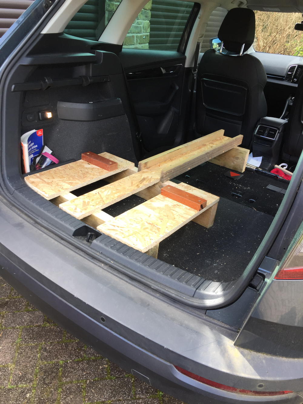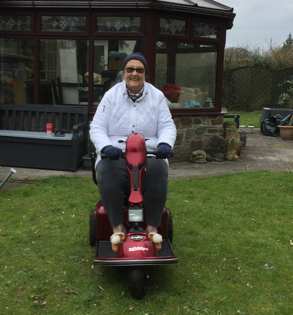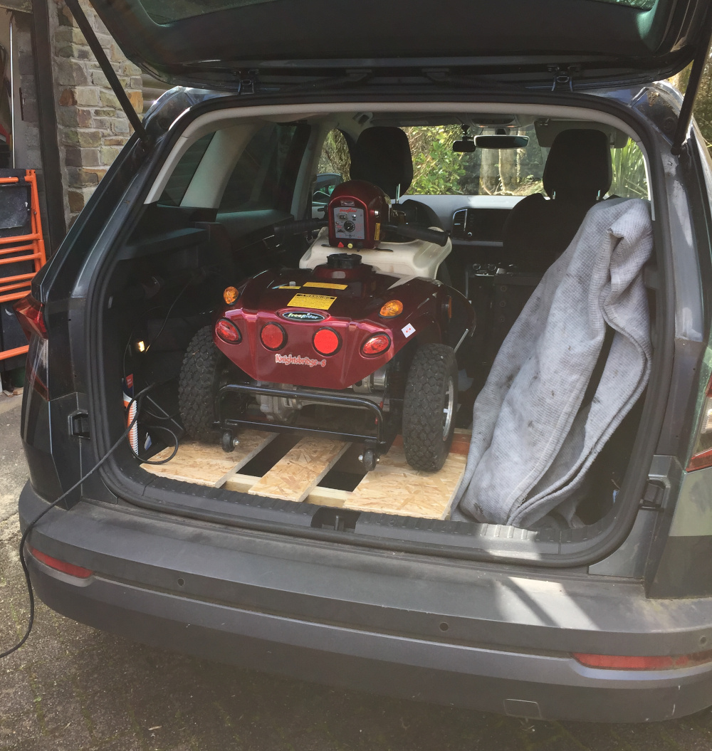 We purchased a second hand mobility scooter for June to give her a bit of freedom. It’s a hell of a beast weighing over 60kg, with solid tyres and a captains seat. June took her chariot around the garden and saw areas she had never seen before. We’ve been for a few local runs to see the surrounding area and get a feel of battery life, but in order to visit local parks, seaside etc, we would need to go mobile. Even with the scooter broken down into 5 pieces, the back end with the motor is back breaking heavy. We picked up a second hand ramp for £50. It needed some fibreglass repairs, but I managed that with a £17 kit from the local car spares shop. As our car has a 160mm drop into the boot area, I spent Thursday morning making an artisan designed, hand crafted platform to take the chariot (sound better than cobbling something together with what was to hand). All went well until June decided to get the chariot lined up ready for me to put in the car. The only thing was, she caught the ramp with the front wheel, which flipped the scooter and her onto their collective backs just as I shouted stop. Time was 12:14 as can be seen on the cctv when the top of her head appears on the left of the screen. I extricated June from the scooter, but she had bruised her elbow and arm and slightly scratched the scooter. At least it was dry and she didn’t hit her head.