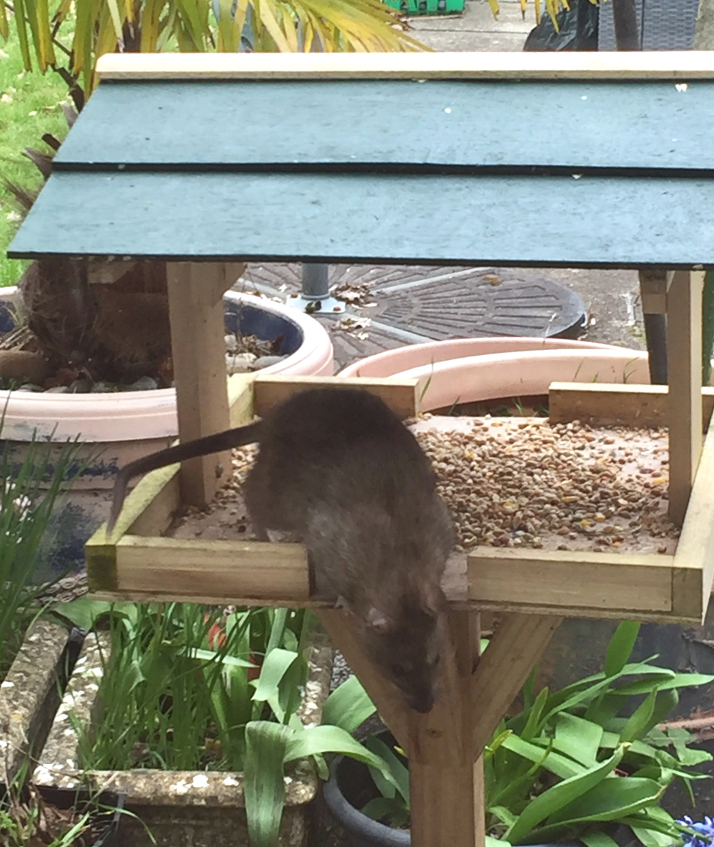 We’ve acquired a new resident in the garden – a brown rat. We noticed it the other night when the outside light came on illuminating it sitting 6 foot up in the bird feeder and yesterday at 11 in the morning, on the bird table. After checking with the neighbours, it seems it’s a common occurrence as we are close to the river with plenty of nooks and crannies and have a ready available supply of food. After putting up another two cctv camera’s, I was aware of the system recording events every few minutes after I went to bed. I switched on the monitor and watched its antics for a while as it went back and forth, up and down the two feeders. I did note that it went towards our neighbours house rather than the river and due to the time between visits, the nest must be quite close by. I feel an electric zapper in design.