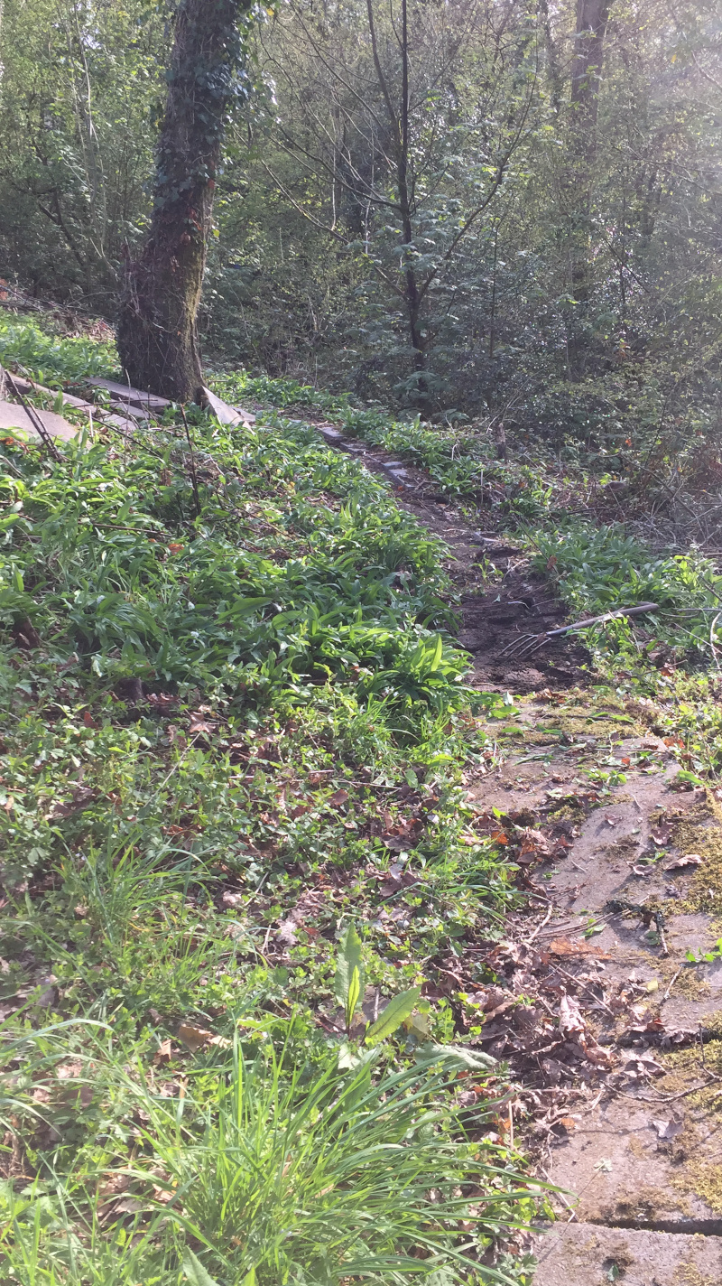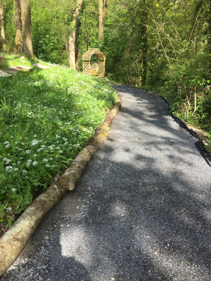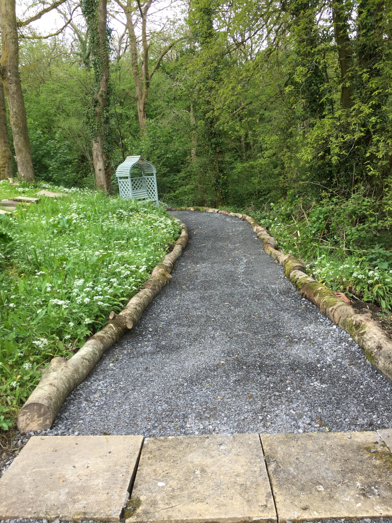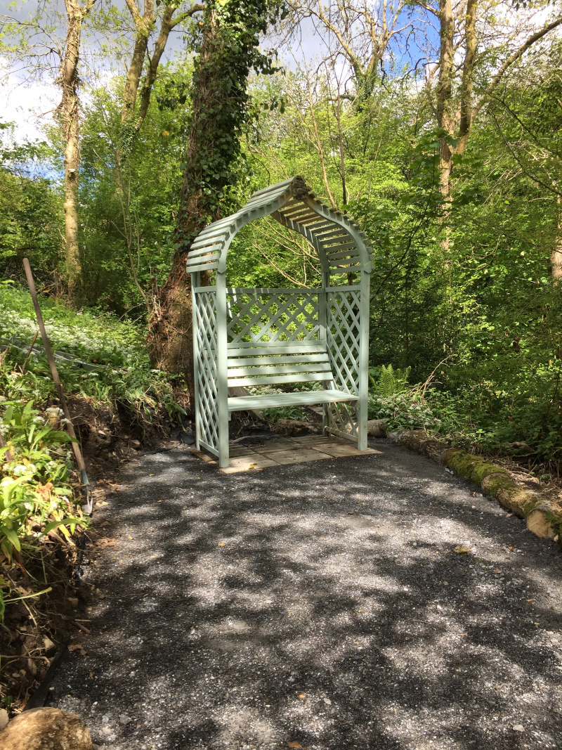 A shortage of cement in South Wales has delayed the chalet base from being finished. It sits and waits in anticipation while the plastic sheeting fills with water. We are still waiting for a delivery date from the supplier and hope we don’t get a “it’l be with you tomorrow call” for at least a week. As Dave had 2 one ton bags of grit on his trailer ready for the concrete base, he and Rob barrowed it straight down to the ‘garlic path’ by the stream/river (depends on the water level) to finish that job. I picked up an arbour from Home Bargains for £130 which was way under the going rate. I will put this at the path end. Hopefully, I will get the edging logs to the path done in the next two weeks and will have a full set of pictures from its discovery in August to the finished result.
