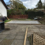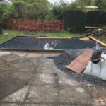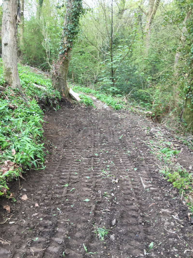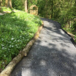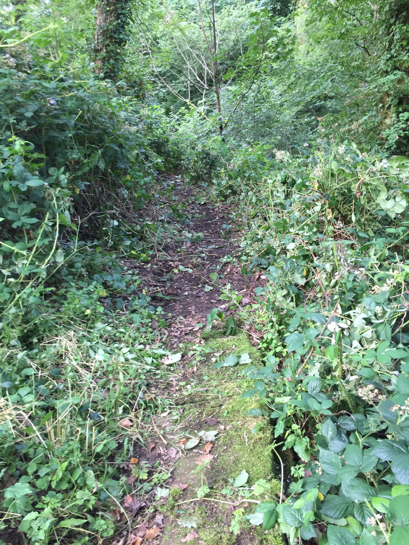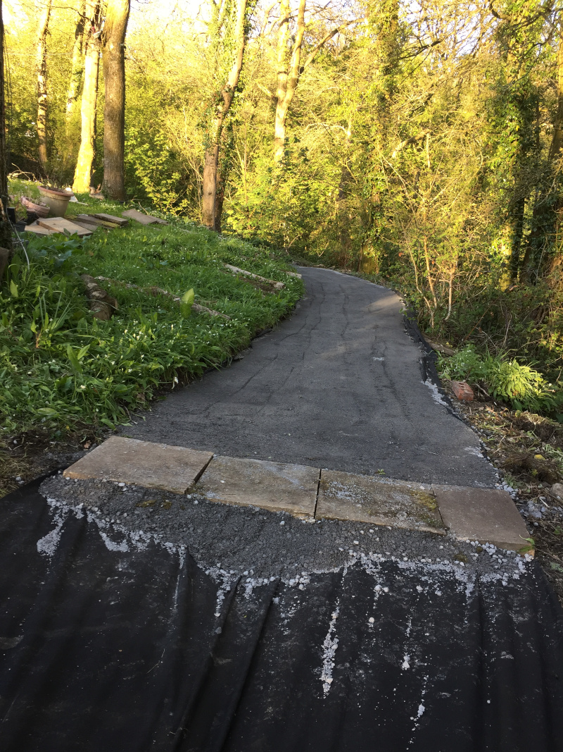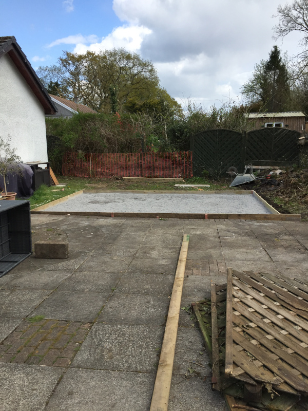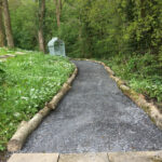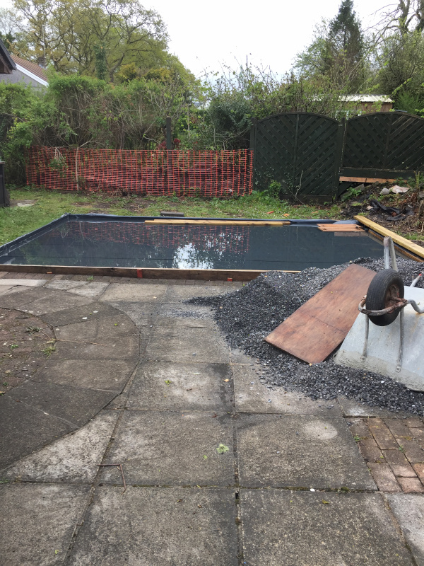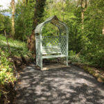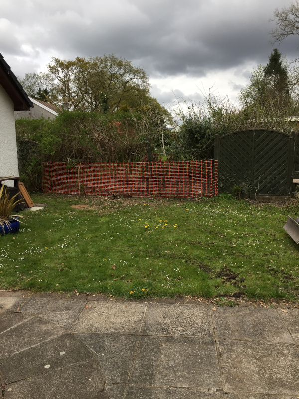 A shortage of cement in South Wales has delayed the chalet base from being finished. It sits and waits in anticipation while the plastic sheeting fills with water. We are still waiting for a delivery date from the supplier and hope we don’t get a “it’l be with you tomorrow call” for at least a week. As Dave had 2 one ton bags of grit on his trailer ready for the concrete base, he and Rob barrowed it straight down to the ‘garlic path’ by the stream/river (depends on the water level) to finish that job. I picked up an arbour from Home Bargains for £130 which was way under the going rate. I will put this at the path end. Hopefully, I will get the edging logs to the path done in the next two weeks and will have a full set of pictures from its discovery in August to the finished result.