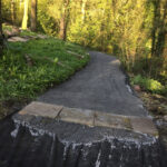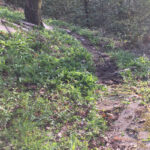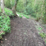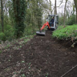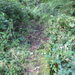 The garlic path or path to nowhere is finished. From the initial finding some paving slabs in brambles back last August has been interesting and rewarding. I had no idea back then what it was, or what it would look like, but we are pleased with the results. The arbor has had a coat of paint (sprayed on to save time) and has a distressed, well worn look. I suppose if I gave it a second coat, then it would have a new look to it. The log edging is secured with 10mm rebar with the help of a 10mm auger bit and a SDS hammer drill to drive the rebar in. I purchased some 450mm long bits off eBay to deal with the assortment of logs and the rebar came in 3m lengths and was cut to length with an angle grinder. Now looking down from the path to the river below, I see a piece of of land. It’s about 5m below the path and is about 5x20m in size and reasonably flat. Now what can that be used for?