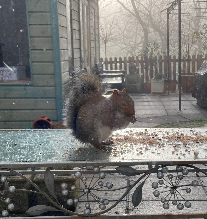 I’ve got a critter watching me write this – a young scatty squirrel chomping on seeds and bread, less than a metre away.